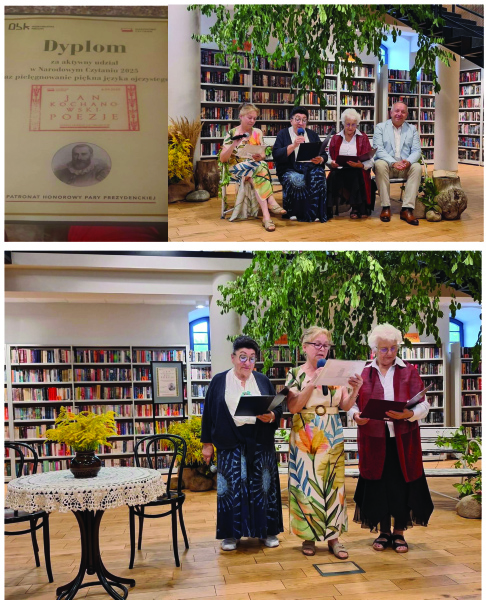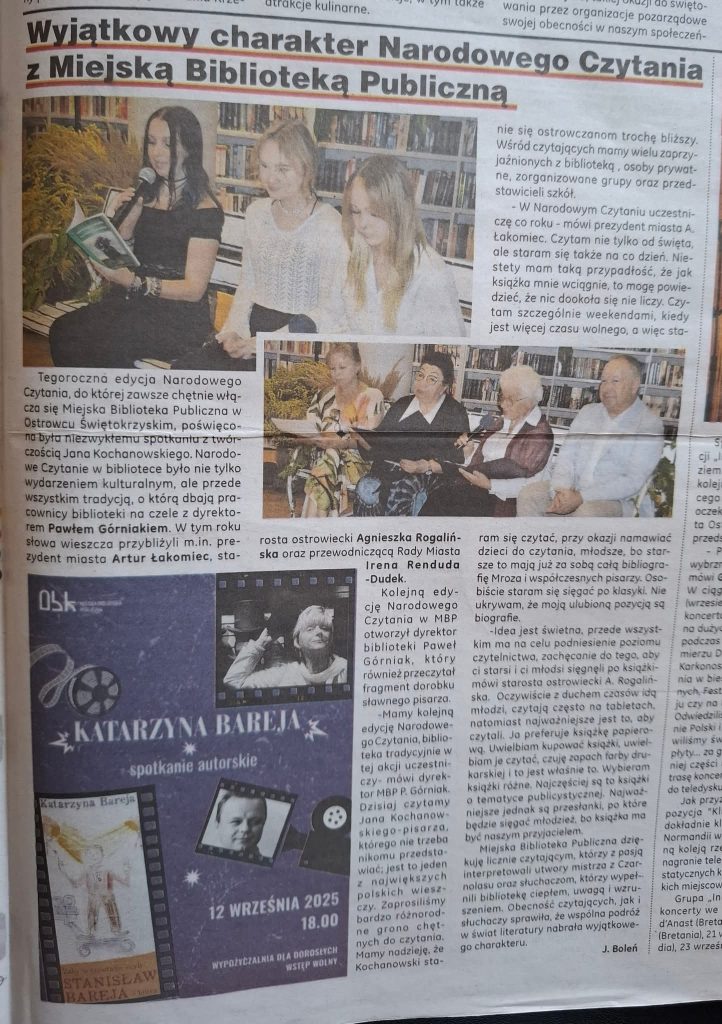 06.09.2025 w Bibliotece Miejskiej Ostrowieckiego Browaru Kultury odbyła się tegoroczna edycja Czytania Narodowego, poświęcona została Mistrzowi Słowa Janowi Kochanowskiemu. Twórczość jego do dziś zachwyca mądrością i pięknem. A tematyka utworów aktualna jest do dziś.To żywe spotkanie z literaturą wzrusza: bawi i łączy pokolenia. NIE MOGŁO NIE BYĆ NA TYM WYDARZENIU, SENIORÓW Z UTW. Krystyna Janiszewska, Irena Metyk i Irena Podsiadły przeczytały: Pieśń II – ” Serce roście patrząc na te czasy………” i Psalm 8 – ” Wszechmocny Panie, wiekuisty Boże, Kto się Twym sprawom wydziwować może?….”. Przedstawione były również fragmenty książki biograficznej Jana Kochanowskiego: ”Kto mi dał skrzydła”