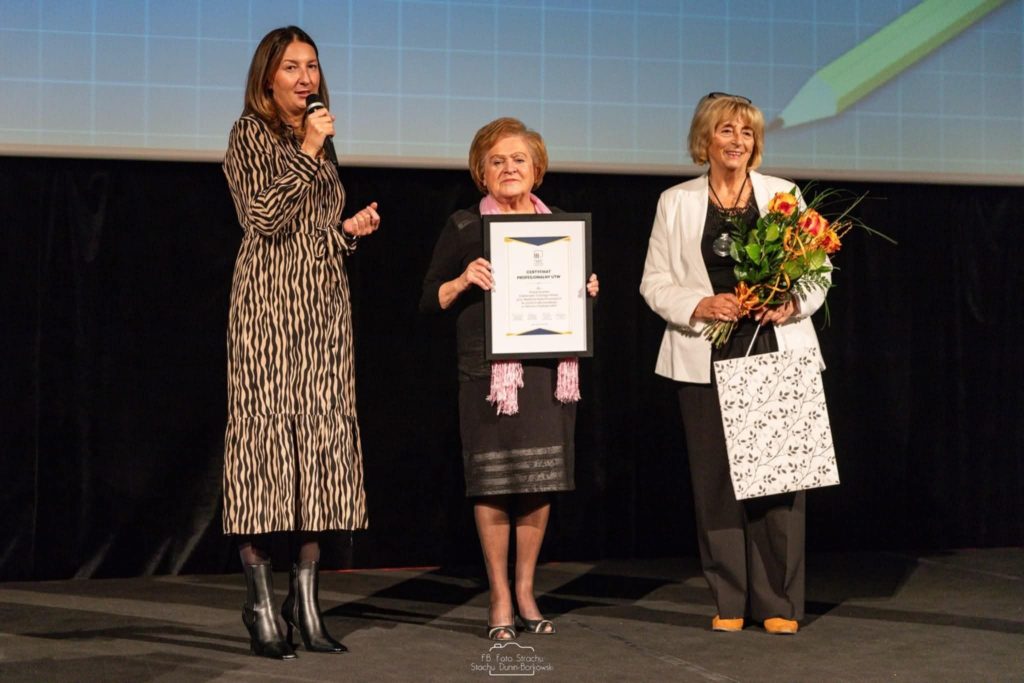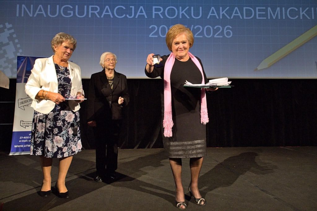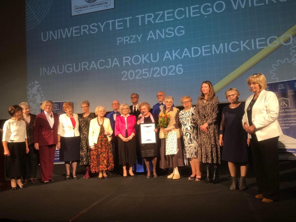 06.10.2025 r. w sali kinowej MCK OBK, Słuchacze UTW przy ANSG uroczyście zainaugurowali rok akademicki 2025/26. Na widowni zasiedli Słuchacze i zaproszeni GOŚCIE, wśród których byli obecni przedstawiciele Władz samorządowych, Powiatu, Województwa, Uczelni Patronackiej i Organizacji i Instytucji współpracujących z UTW. Zabierając głos , na ręce Pani Prezes złożyli podziękowania, gratulacje za dotychczasową owocną pracę słuchaczy na rzecz środowiska lokalnego i społeczności seniorskiej a także życzenia dalszych sukcesów w realizacji celów i zadań uczelni dla seniorów – UTW. Pani Prezes –Matylda Niewójt przyjęła ślubowanie od słuchaczy nowo wstępujących do UTW. Wspólnie z Chórem UTW odśpiewano „Gaudeamus Igitur”. W tym uroczystym dniu. rozpoczynającym nowy -23 rok akademicki , został wręczony Pani Prezes UTW Certyfikat „PROFESJONALNY UTW” przez Przedstawicielki Ogólnopolskiej Federacji Stowarzyszeń UTW w Nowym Sączu, Panie: Wiesławę Borczyk i Katarzynę Borczyk. Jest to odznaczenie potwierdzające i doceniające ogromny wkład pracy i zaangażowania Władz i Słuchaczy UTW w realizację celów i zadań Stowarzyszenia. W uroczystości inauguracyjnej wzięły udział znamienite GOSCINIE- EWA MAŃKOWSKA i IRENA MOSKAL z UTW im. prof. Haliny Szwarc w Warszawie, który obchodzi 50-lecie powstania. ( 1975 r)