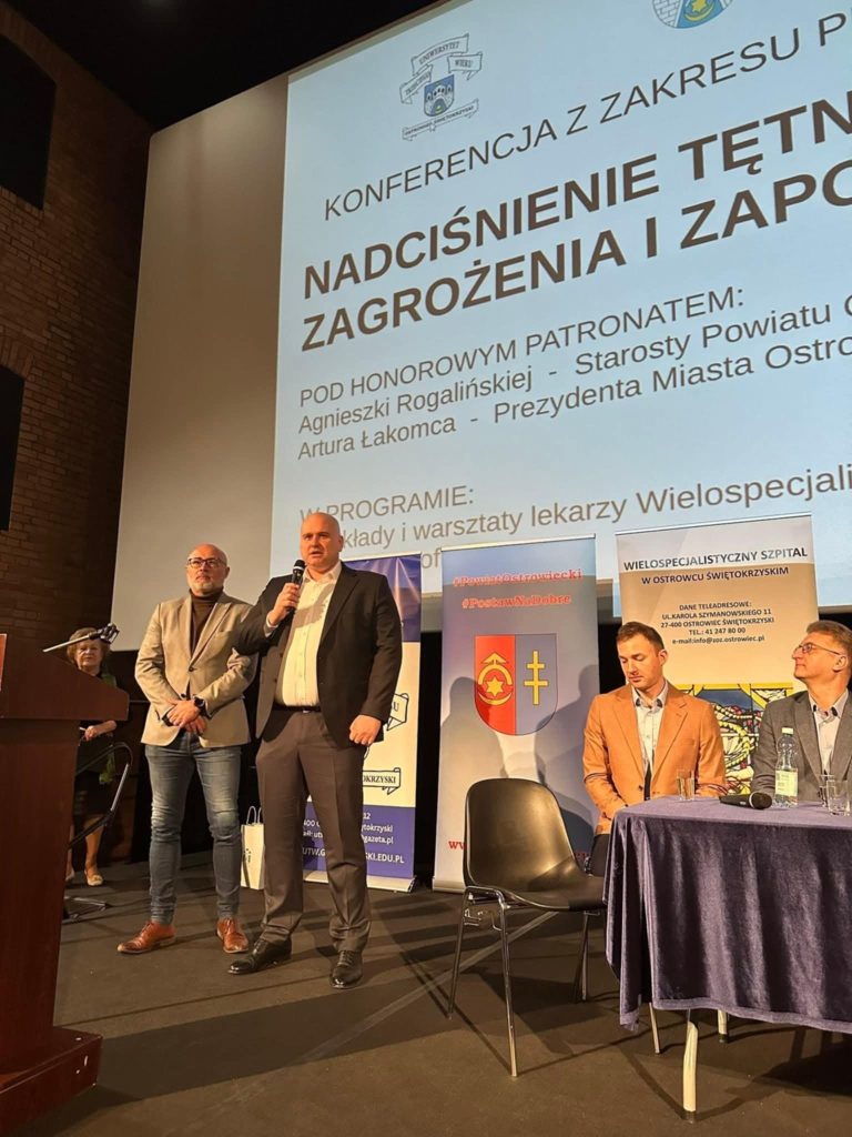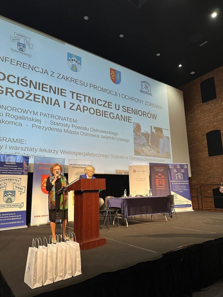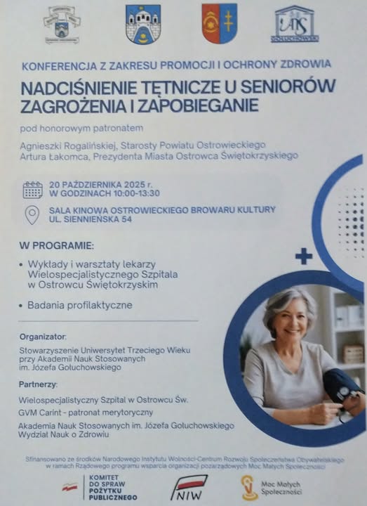 20 październik 2025 Stowarzyszenie Uniwersytet Trzeciego Wieku przy ANSG w ramach projektu zorganizowało konferencję z obszaru ochrona i promocja zdrowia pn. „NADCIŚNIENIE TĘTNICZE U SENIORÓW. ZAGROŻENIA I ZAPOBIEGANIE” Koordynator regionalny- Lokalna Grupa Działania Krzemienny Krąg. Celem konferencji było wzbogacenie wiedzy seniorów o objawach, przyczynach i skutkach nadciśnienia tętniczego, zwłaszcza zawału serca, udaru i innych powikłań. Profesjonalni lekarze kardiolodzy z: GVM Carint-Centrum Kardiologii Inwazyjnej oraz z Oddziału Kardiologii Wielospecjalistycznego Szpitala w Ostrowcu Świętokrzyskim zwrócili uwagę uczestników na sposoby zapobiegania i leczenia nadciśnienia tętniczego. Uczestnicy to grupa 120 osób starszych z różnych środowisk: ostrowieckich klubów seniora, słuchacze UTW oraz przedstawiciele organizacji pozarządowych i seniorzy niezrzeszeni. Skorzystali z wykładów, warsztatów i badań profilaktycznych. Badania przeprowadziły- pielęgniarki studentki z Wydziału Nauk o Zdrowiu ANSG pod przewodnictwem Doroty Połetek oraz z CVM Carint.