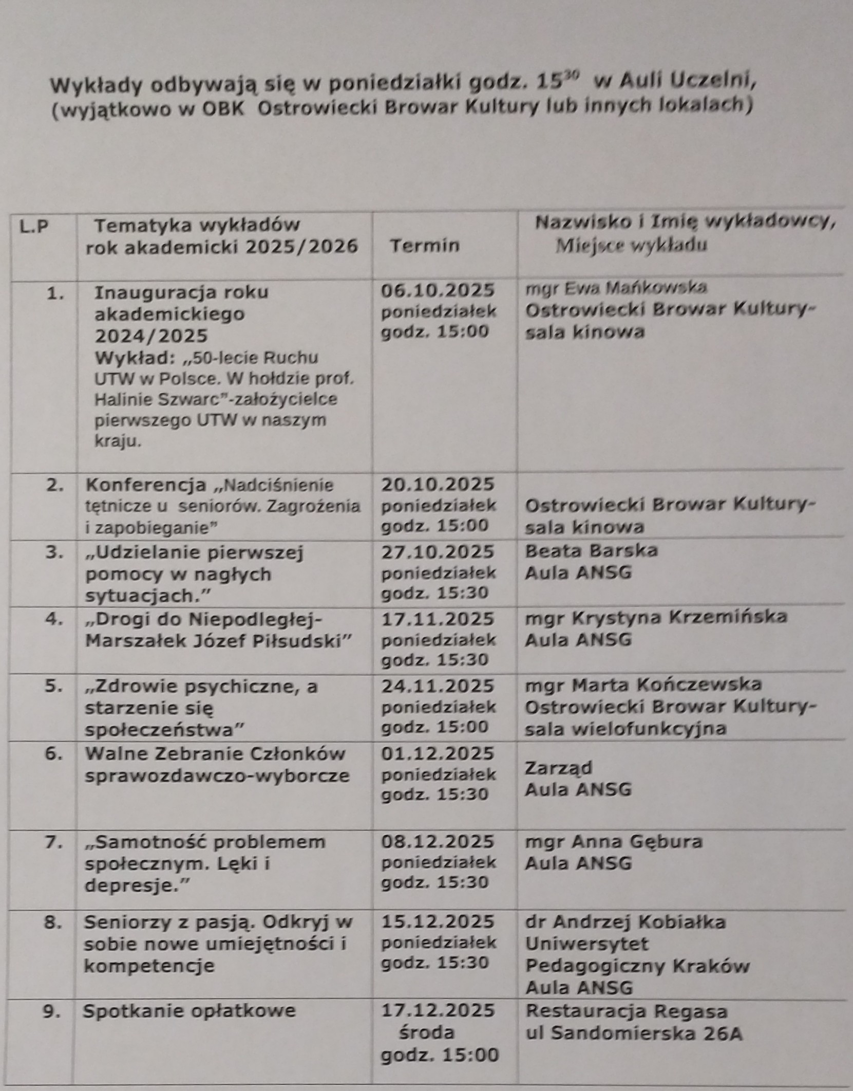 Raz w miesiącu, czwartek, godz.15:00 blok C, sala 22, – 23.10.2025 |